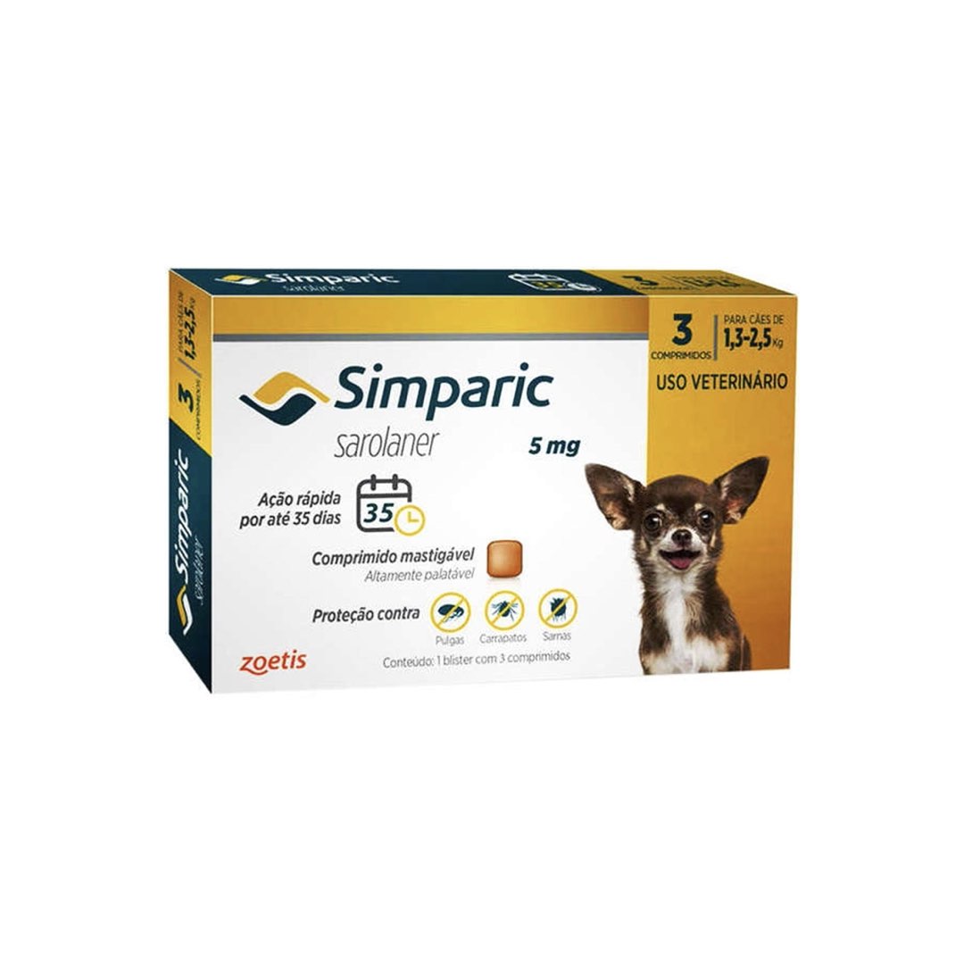 ANTIPULGAS E CARRAPATOS ZOETIS SIMPARIC 5MG C/ 3 COMPRIMIDOS