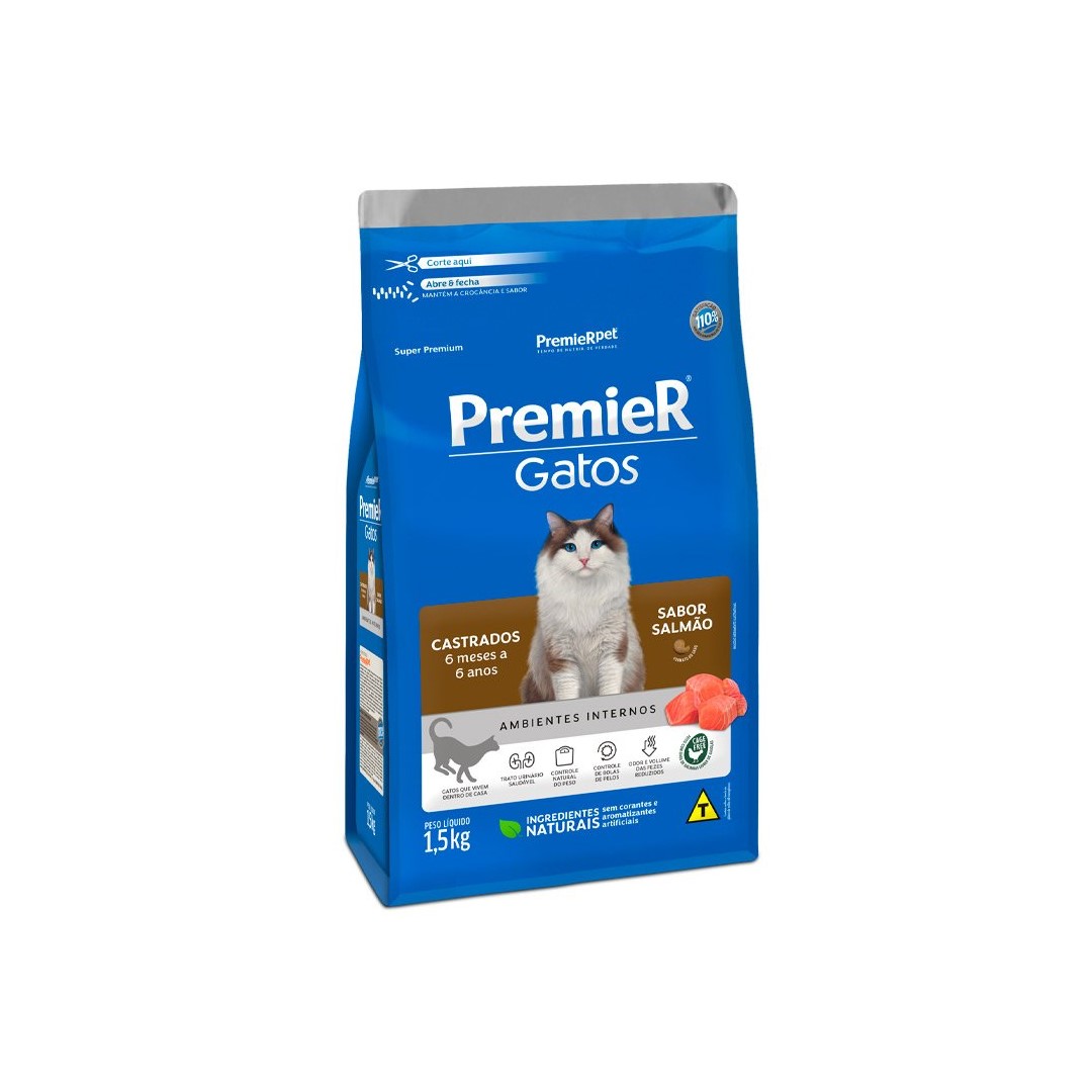 RAÇÃO PREMIER GATOS CASTRADOS 6 MESES A 6 ANOS SALMÃO Tamanho:1,5KG